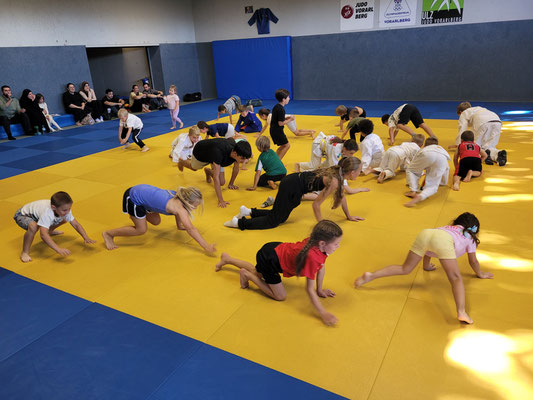 Unsere zahlreichen Anfänger durften sich über ihren Rückenaufnäher (=Backnumber) freuen, den sie gestern beim Training erhielten. Nach dem stolzen Vorzeigen vor der Kamera ging es auf der Tatami wieder zur Sache, es wurde fleißig für die erste Gürtelprüfung und für die ersten Turnier trainiert.